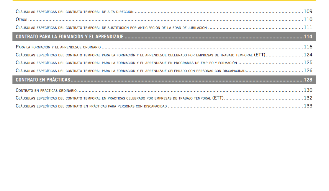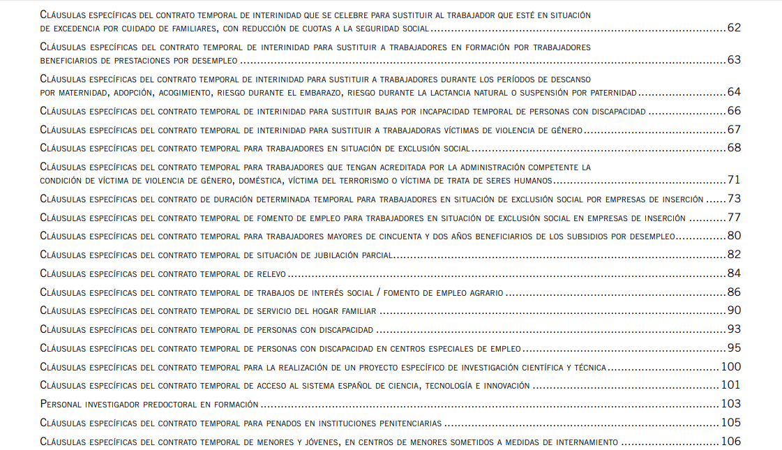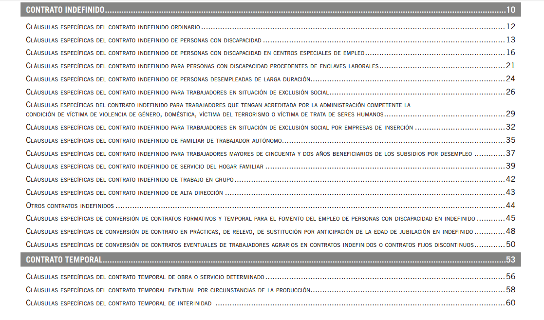 Ahí se muestran en las imágenes, la guía de contratos de trabajo que anualmente realiza el SEPE, explicando con todo lujo de detalles cada uno de los contratos existentes (en las imágenes puedes ver el índice basicamente) y el cual puedes descargar en la página web oficial del servicio andaluz de empleo o para facilitaros la labor en el siguiente enlace: