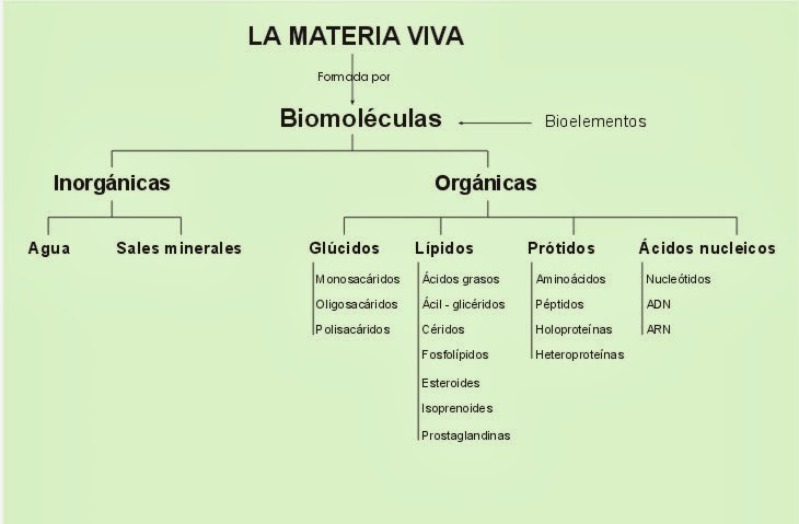 - Biomoléculas inorgánicas: Son las que no son producidas por los seres vivos, pero que son fundamentales para su subsistencia. En este grupo encontramos el agua, los gases y las sales inorgánicas.